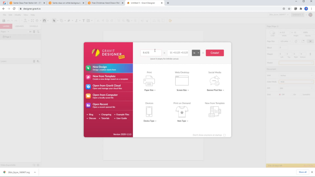 The software I’m going to be using is called GravitDesigner, this is an online software and it’s free to use. First you need to set the width and height, this is very important because if you look at the page you’re going to create we’ll notice that the image goes from one edge of the page to the other so we need to add on something called bleed now we’re going to be creating an 8.5 by 11 inch book so we need to add bleed because this image will be trimmed by amazon when the book is printed so we need to add 0.125 inches to the top and bottom of the page and 0.125 inches to the one of the vertical edges so this means our book will be 8.625 by 11.250 inches so we’ll go and add that into GravitDesigner.